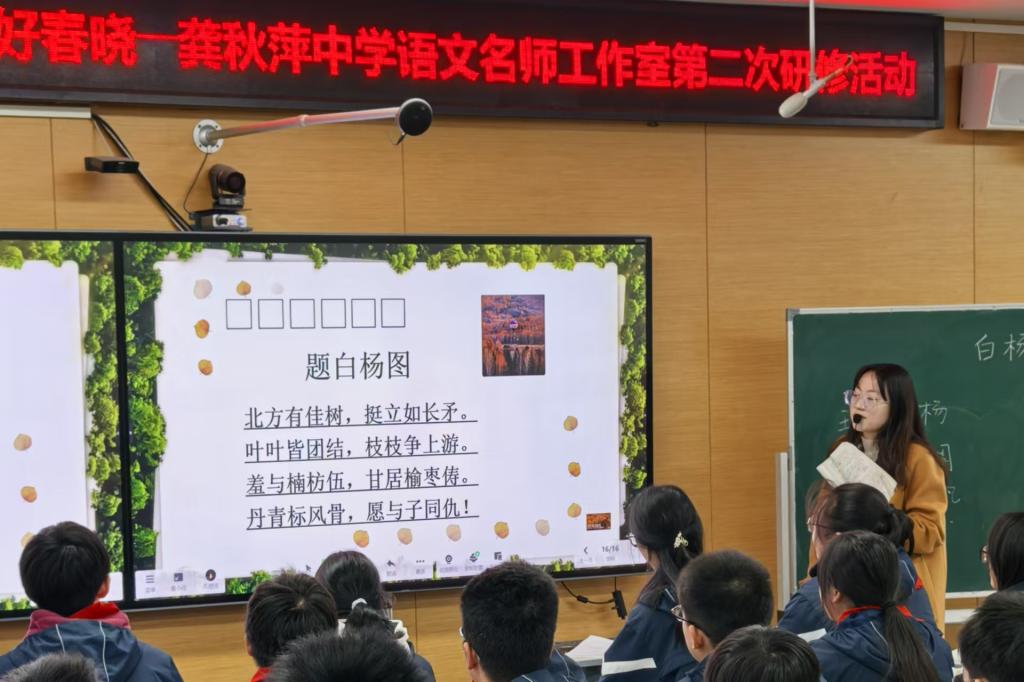 随后,孔煜凌老师引领八年级学生走进《白杨礼赞》的文学世界。她以细腻入微的讲解和生动鲜活的引导,助力学生深刻理解白杨树所蕴含的坚韧不拔、团结向上的精神品质。课堂上,孔老师高度注重对学生朗读技巧的雕琢和文学鉴赏能力的培养,以绘画、音乐、文学三者相结合的形式提高学生的审美能力。师生之间互动频繁、默契十足,学生们全身心沉浸于茅盾先生饱含深情的文字海洋之中。