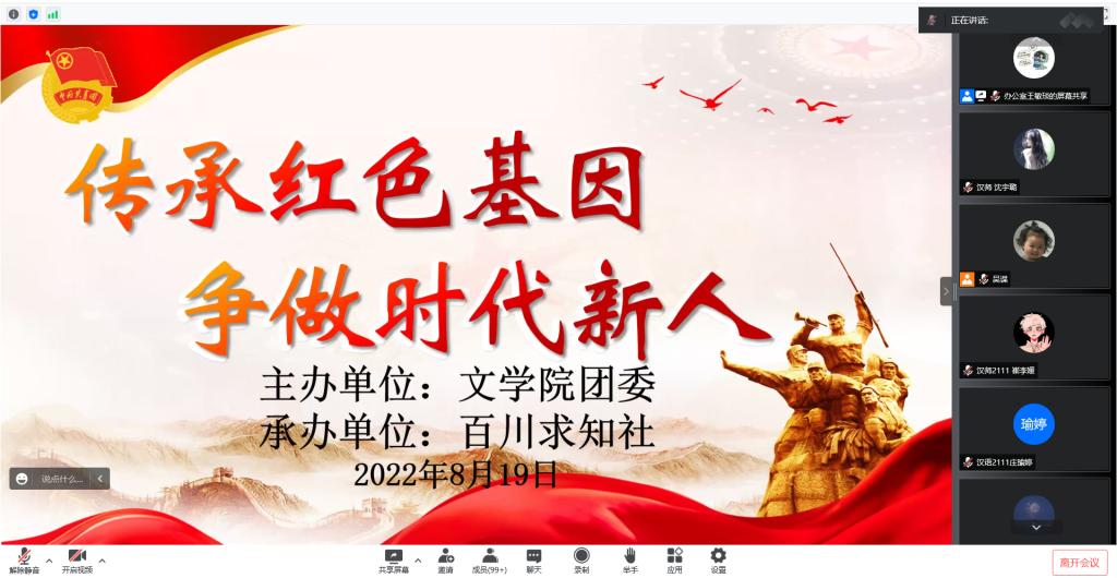为深入学习习近平总书记《论党的青年工作》,全面贯彻党的教育方针,引领我院学生赓续红色血脉、发扬革命精神,伟德国际victor1946百川求知社于8月19日线上开展“传承红色基因 争做时代新人”——关于《让红色基因、革命薪火代代传承》的专题学习活动。本次学习会由王敏琰同学主讲,伟德国际victor1946各年级200余名学生参与了此次学习会。