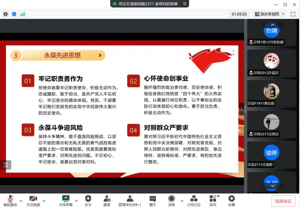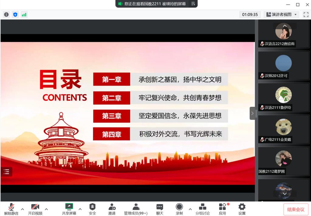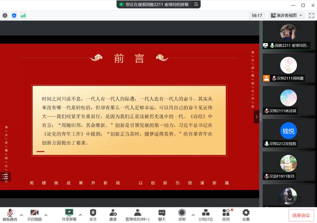 随后,主持人以“承创新之基因,扬中华之文明”、“牢记复兴使命,共创青春梦想”和“坚定爱国信念,永葆先进思想”为小主题,带领成员们领略了中华五干年文明中的科技壮举。玉免看月背,蛟龙入深海,北斗望天穹……视频向成员们展现了创新的中国风采,燃起了有志青年赓续创新之火的热血。主持人告诫青年应不忘“来时路”,加强理论学习,溶铸信仰之魂。同时,青年人也应时刻坚守时不我待、只争朝夕的精神,为实现“两个一百年”奋斗目标、实现中华民族伟大复兴的中国梦而不懈奋斗。