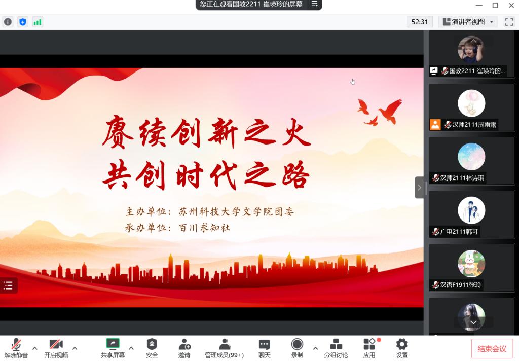 会议开始,百川求知社成员们在主持人崔瑛玲同学的带领下,学习了党中央发布的纲领性工作文件。通过学习,成员们对习近平总书记在《论党的青年工作》中对吾辈青年在创新方面提出的要求有了深刻的领悟。