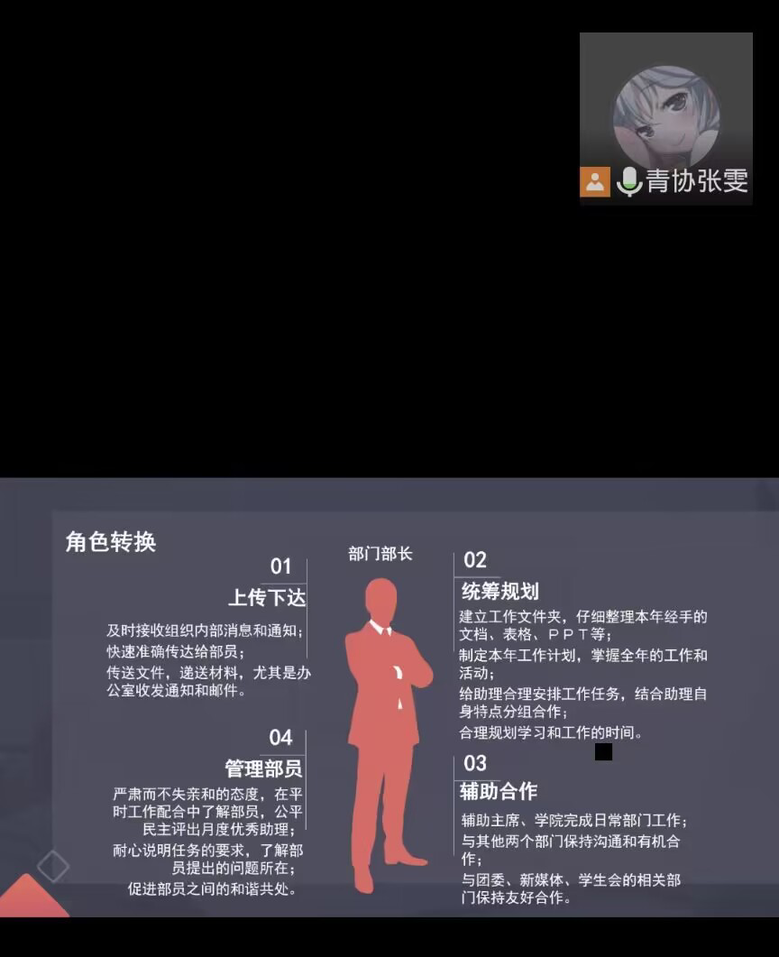 博毓青协张雯、张伊迪向部门成员说明了青协工作中的内容,并仔细剖析了青协工作所需要的精神品质,强调培育四大核心工作能力的重要性,为成员答疑解惑,为成员指名工作学习的方向,带领全体青协成员为协会、为学院奉献自己的力量。
