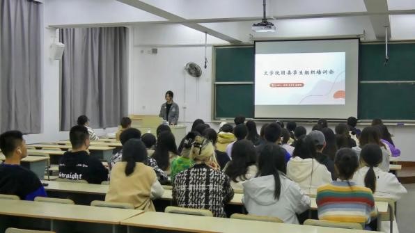 团委副书记陈悦和李竺员仔细向大家讲解了借用教室、张贴悬挂物和开发票的流程,以及撰写新闻稿的注意要点。最后,陈悦以个人素养提升为切入点,从学业发展、技能提升、人际交往和自我修养四方面介绍了自己的经验与心得,鼓励学生骨干争做“有理想、敢担当、能吃苦、肯奋斗”的新时代好青年。