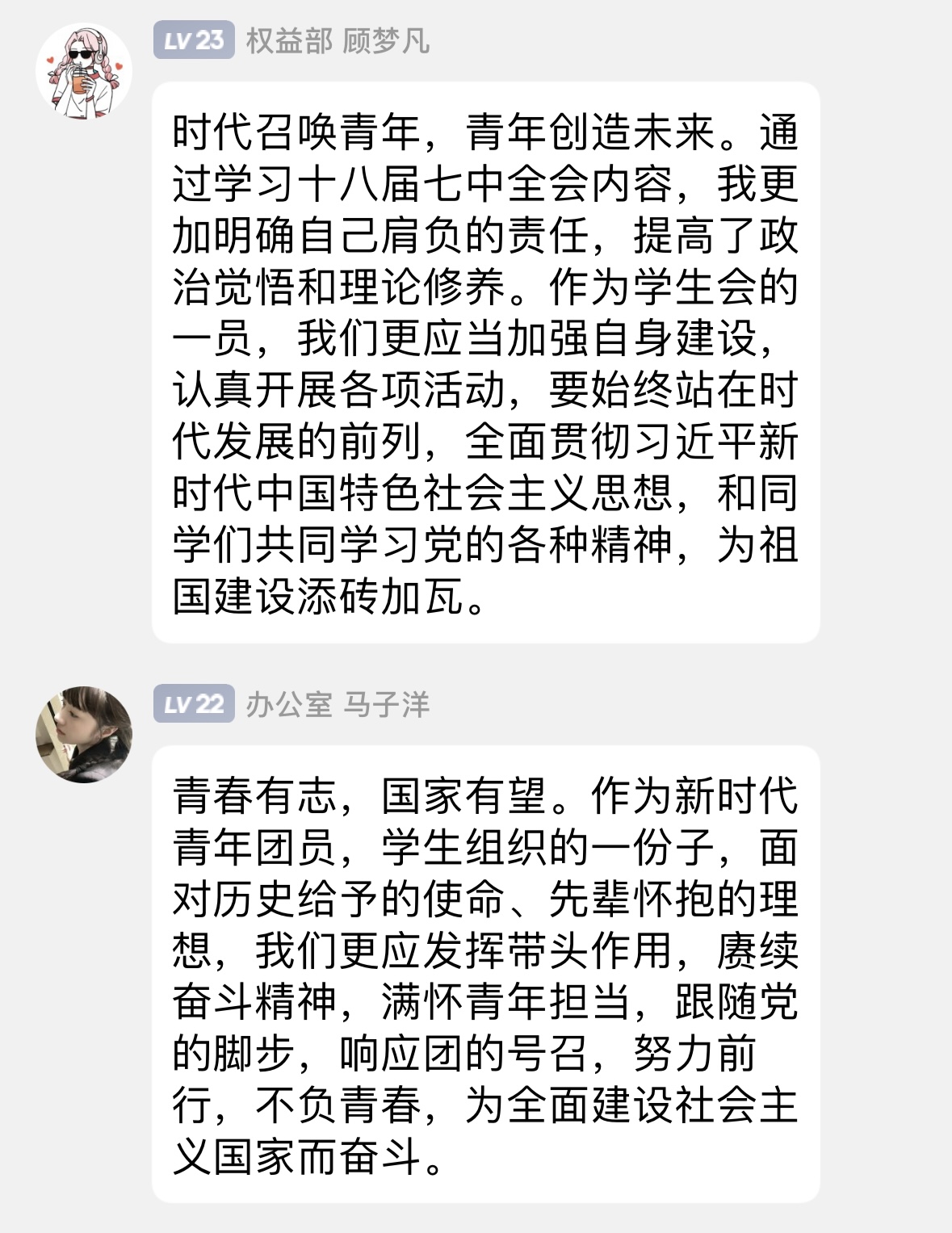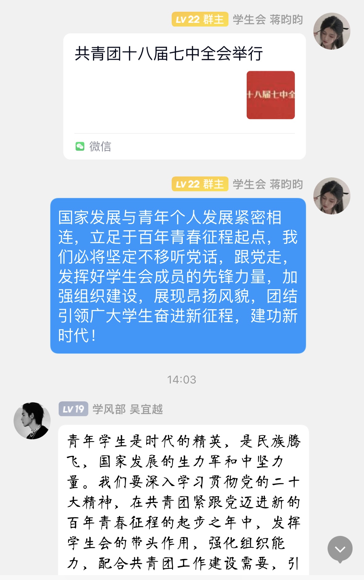 为深入贯彻落实习近平总书记关于青年工作的重要思想,不断深化学生会组织改革建设,伟德国际victor1946学生会于线上开展共青团十八届七中全会学习活动,进一步规范学生会成员的思想引领和日常管理,成员们积极响应号召,共同思考讨论,学习会议精神,感悟青春使命。