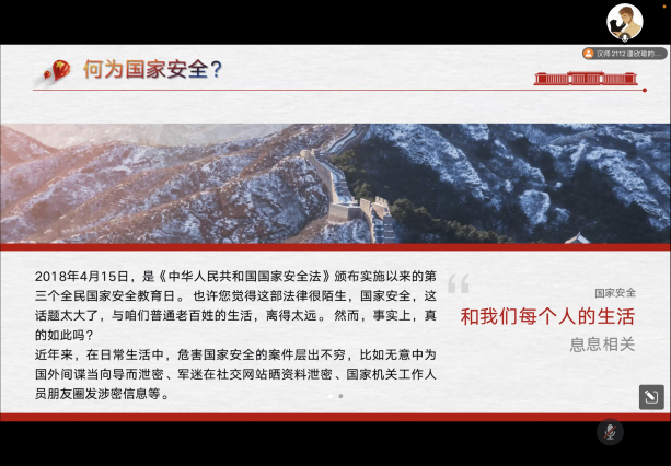 第二部分为知识宣传部分,通过宣传短片与微课视频充分整合国家安全相关学习资源,全体参加人员通过短片学习进一步了解危害国家安全的行为及相关罪名,进一步树立了“国家安全,人人有责”的观念,坚定保卫国家安全的使命。