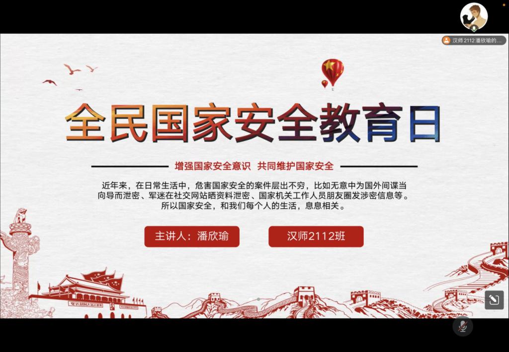 第一部分为常识普及部分,通过演示文稿的方式,对国家安全知识进行了系统的普及。从国家安全基本内容、设立教育日的现实意义、人人都是国家安全的主角三方面向大家详细的讲解了国家安全教育日的有关知识,让参会同学对国家安全知识有了更明确的认知。