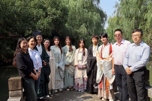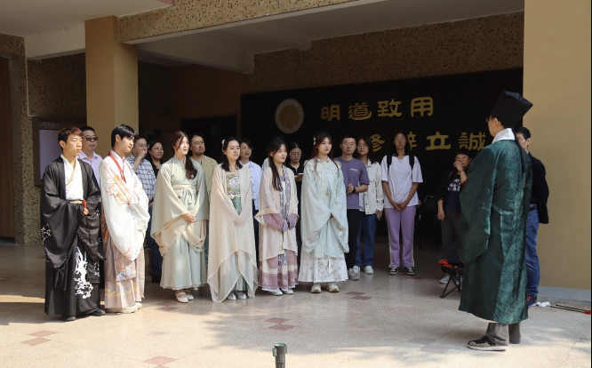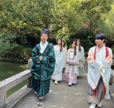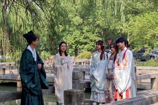 《左传》曰:“中国有礼仪之大,故称夏;有服章之美,谓之华。”在穿汉服的活动中,吴松老师向师生们讲述了中国古代的服装知识。如拜谒活动中的袍服,雍容豪气;舞乐百戏中的舞装,飘逸洒脱;角抵戏中的短襦短裤,英勇精干;家居生活中提壶、捧奁盒的侍女,宽袖束腰,清新华贵……汉服文化是中华传统文化的重要组成,是中华民族的精神火炬,传达了新时代中国青年对传统的喜爱和赞美。为弘扬中华优秀传统文化,展现汉服之美,伟德国际victor1946师生共同身着传统汉服,游历于九曲桥上。