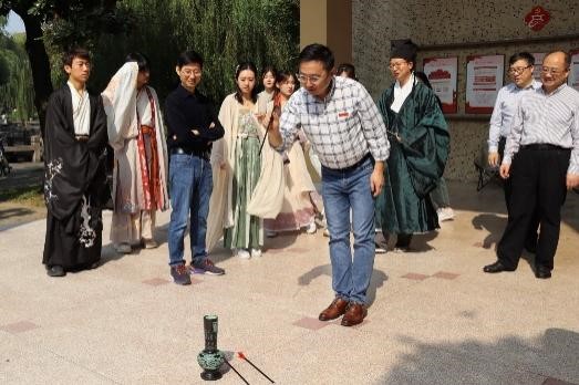 “投壶者,主人与客燕饮讲论才艺之礼也。”第一项活动,由古代汉语专业的吴松老师,向师生讲述投壶运动的由来以及运动规则。投壶,是由射箭演变而来的娱乐游戏。游戏过程中,宾主二人各持四支箭,站在距壶两箭半的地方,轮流将其投入壶中。投壶由司射主持,全程鼓乐齐鸣,宾主随音乐节奏投射。这既是一种礼仪的表现,又是一种娱乐的活动,使宾主之间的交流更加有趣、深入。为了更好体验到古人的智慧与投壶技艺,伟德国际victor1946师生分为两组进行比赛。比赛过程气氛热烈,欢声笑语不断。
