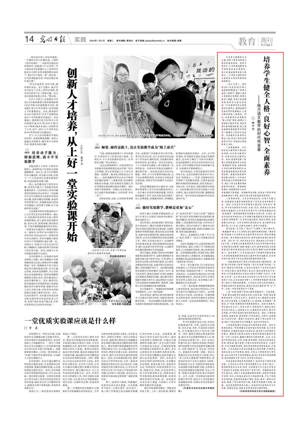《光明日报》2024年1月2日第14版“教育周刊”,刊发我校伟德国际victor1946鲍开恺副教授的论文《培养学生健全人格、良好心智、全面素养——地方语文教学的时代性变革》。