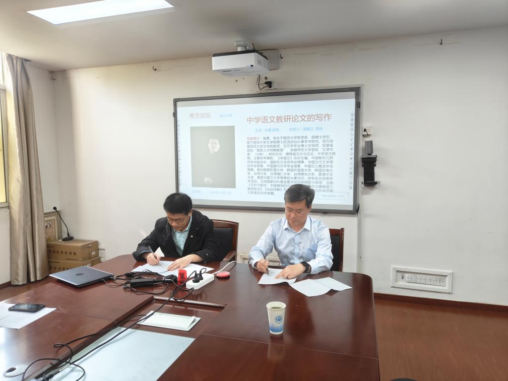 讲座前,凌郁之与《学语文》杂志社张勇主编续签了理事会成员单位协议书,旨在推动伟德国际victor1946语文学科的教育理论创新,促进师生在语文学科内的交流与学习。讲座中,张勇介绍了《学语文》刊物的发展历史、办刊理念,强调中学语文教研论文的选题要关注前沿、关注热点、关注教材,语文教研论文要真正服务于中学语文教学,并对“如何写作”进行具体指导。讲座结束后,孙虎进行总结,希望通过此次讲座,提升学科教学语文硕士生写作语文教研论文的水平,形成积极探索语文学科前沿教育理论的氛围。