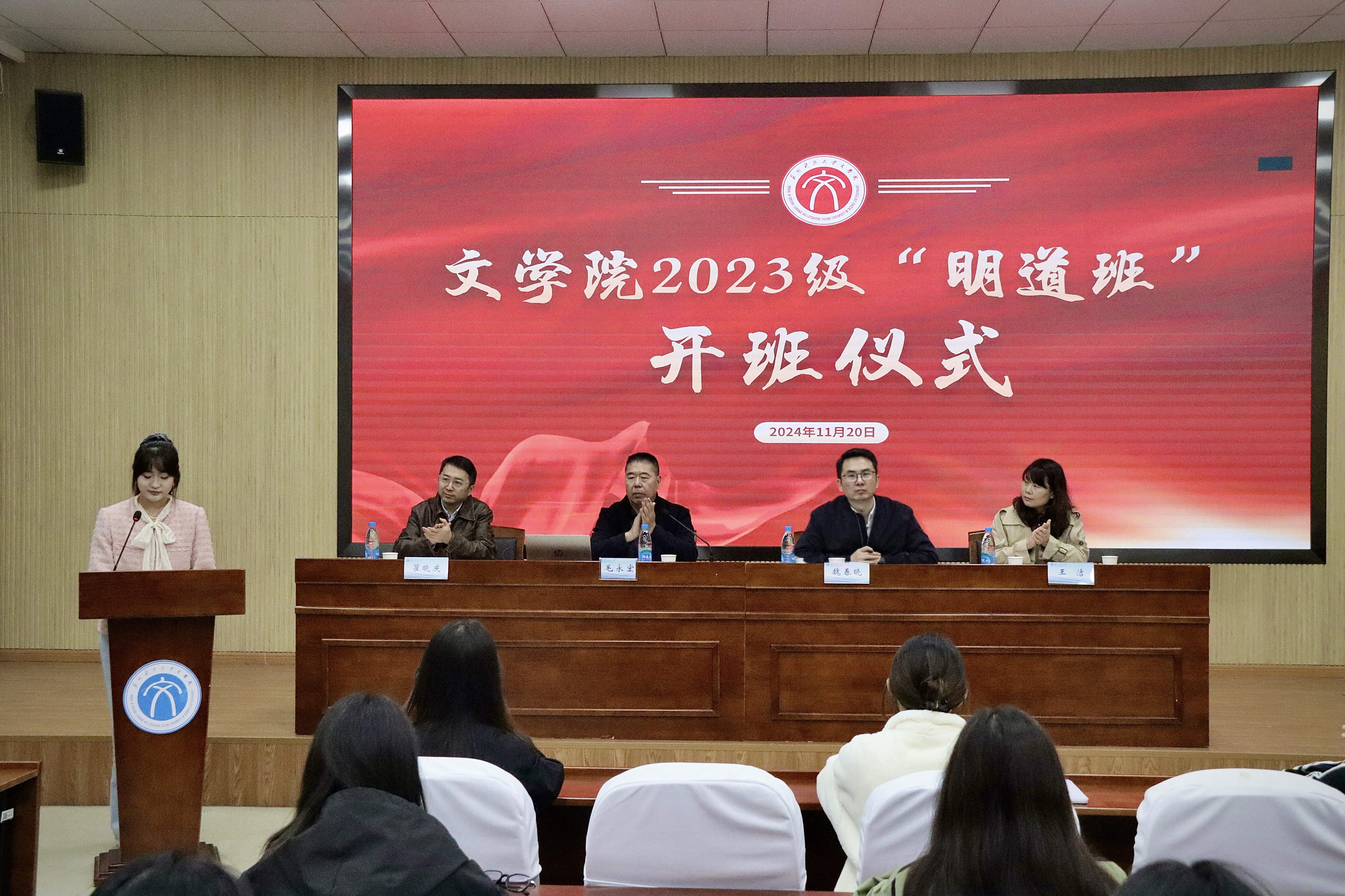 为进一步加强大学生思想政治教育,提升本科人才培养质量、教育引导广大学生关注民生、服务基层,伟德国际victor1946在2023级各专业本科生中择优选拔,组建了2023级“明道班”。11月20日下午,伟德国际victor1946党委书记毛永宏、党委副书记兼副院长瞿晓庆、2023级辅导员沈海洲以及2023 级“明道班”全体学生参加开班仪式暨开班第一课,狮山横塘街道办事处副主任魏春晓、狮山横塘街道何山社区党委书记王洁应邀出席。仪式由陆佳烨同学主持。