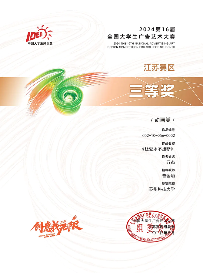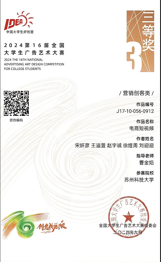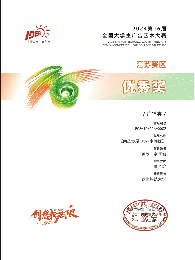 伟德国际victor1946广电系学子在第16届全国大学生广告艺术大赛中斩获佳绩,在广电系曹金焰老师的指导下,宋妍彦、王溢萱、刘迎迎团队获营销创客类全国三等奖。万杰同学的动画类作品《让爱永不挂断》获江苏赛区三等奖。黄欣、季柯谕同学的广播类作品《朗圣赤尾ASMR水滴版》获江苏赛区优秀奖。