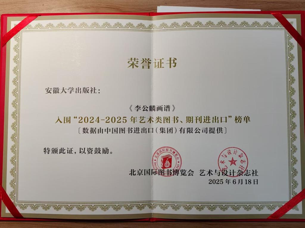 近日,由中国图书进出口(集团)有限公司主办的第三届北京国际艺术出版论坛在国家会议中心隆重召开。会上,发布了“2024-2025年艺术类图书、期刊进出口榜单”。该数据由中国图书进出口(集团)有限公司提供。本次榜单入选图书、期刊共计29种,其中国内图书学术著作10种,伟德国际victor1946凌郁之教授承担的国家社科基金后期项目结项成果、安徽大学出版社出版的《李公麟画谱》(英语题目:The Complete Documentation of Li Gonglin’s Painting Art)入选。