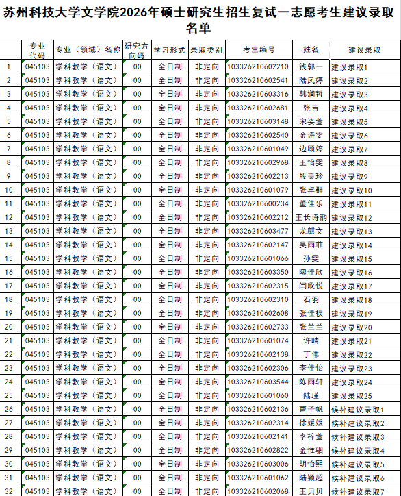 伟德国际victor19462026年硕士研究生招生复试一志愿考生建议录取名单