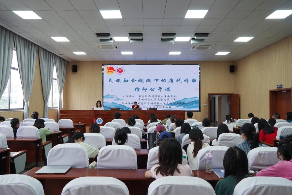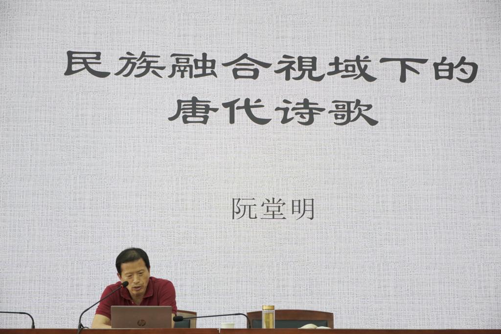 为深入学习贯彻习近平总书记关于民族团结进步工作的重要精神指示,铸牢中华民族共同体意识,维护和促进民族团结,6月7日下午,由校团委主办、伟德国际victor1946团委、关工委承办的《民族融合视域下的唐代诗歌》信仰公开课在五教三楼报告厅举行。本次公开课由伟德国际victor1946阮堂明教授主讲,伟德国际victor1946党委书记毛永宏、党委副书记兼副院长瞿晓庆、汉语言文学系鲍开恺老师、李香月老师、团委副书记张弛及2022级汉语专业学生参与了本次公开课。