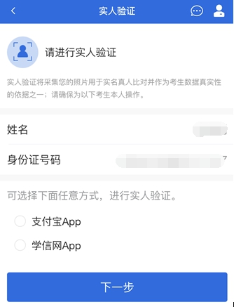 首次登录系统时,考生须进行实人验证,可从“支付宝App”和“学信网App”中任选一种方式进行验证。下面以学信网App为例进行介绍。