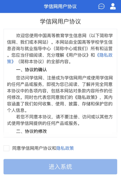 进入系统登录页面,使用手机号或身份证号、密码,即可登录。登录后,请认真仔细阅读学信网用户协议和隐私政策,勾选“同意”方可进入系统。