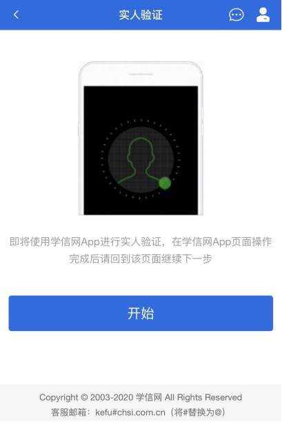 若考生从移动设备登录系统,则选择“学信网App”方式后,在移动设备页面点击【开始】,按照提示进行实人验证操作,完成后点击“返回首页”回到原操作的浏览器进行后续操作。