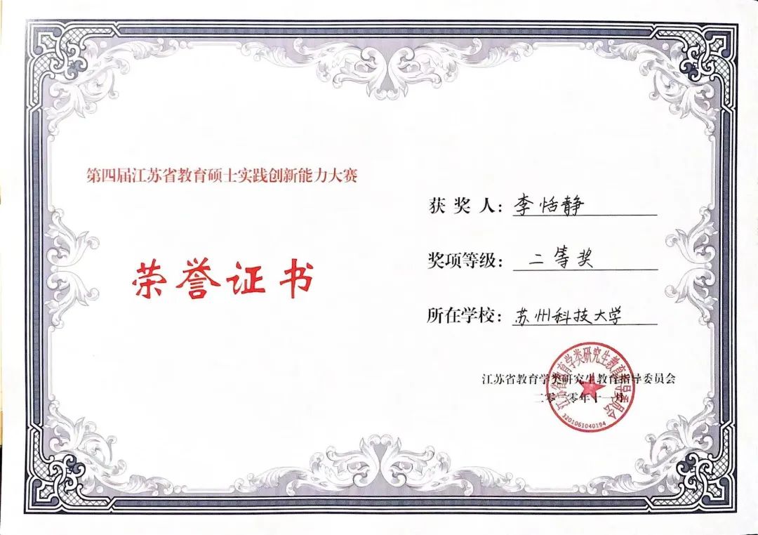 本领域共有硕士研究生导师16人(中含兼职导师2人,皆为中学语文特级教师、正高级教师),其中教授9人、副教授5人,14人具有博士学位,导师中具有高级职称、博士学位的比率都达到88%,已形成了学缘结构多元、学术后劲较强的学术队伍。本领域与江苏省苏州第一中学合作建立了江苏省研究生工作站,另聘有研究生校外兼职指导教师近30人,教师全部都是来自中学一线的教学、科研名师,这些为研究生培养提供了有力支持。本领域于2019年招收首届教育专业硕士研究生。近三年来,学院研究生获得江苏省教育硕士实践创新能力大赛一等奖2项、二等奖1项及第三届中华经典诵写讲大赛硬笔书写优秀奖、第二届全国大学生语言文字能力大赛三等奖等多个国家级奖项,申获江苏省研究生实践创新计划项目8项,研究生对口就业率达到100%。