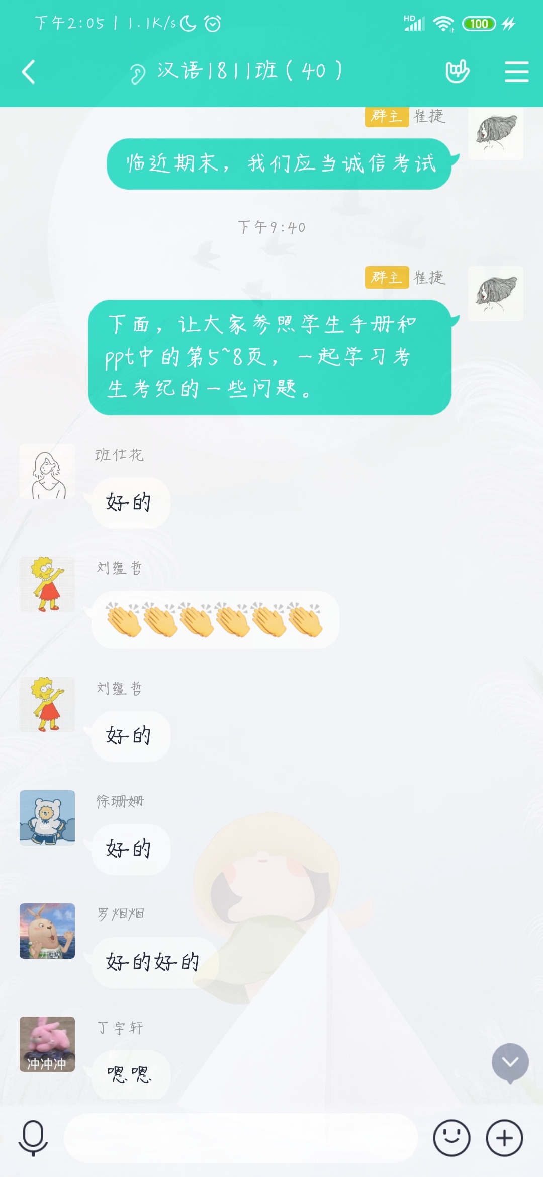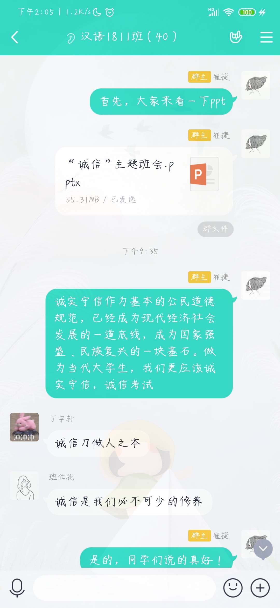 随着期末考试的临近,同学们进入了紧张的复习阶段。为了考试更加公平、公正,也为了让考试更有意义。汉语1811班2020年6月15日线上开展“诚信考试主题班会”,本次班会由班长主持。