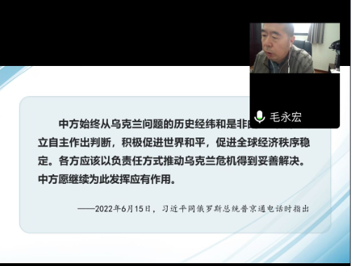 毛永宏书记以《乌克兰危机演变及影响》为主题,分别从复杂的历史经纬、激烈的多维较量、广泛的国际影响、坚定的中国立场这四个方面讲述了乌克兰危机的重大影响以及中方对于乌克兰危机的态度。