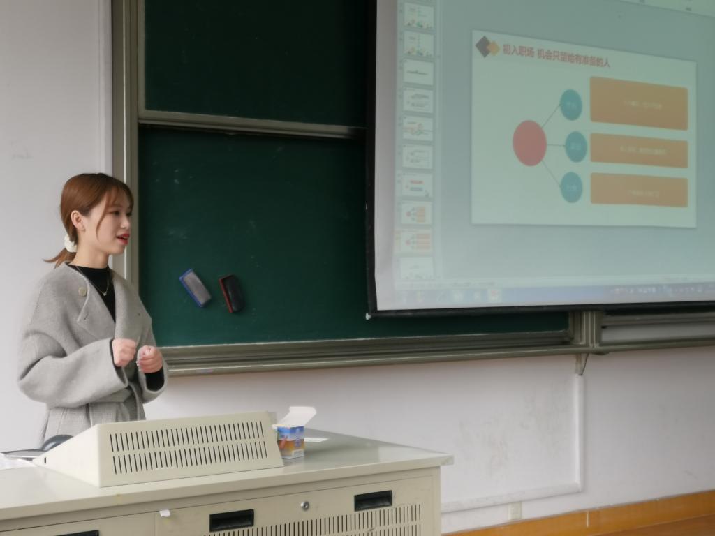 一开始,陈学姐从她的职业生涯聊起,向同学们讲述了她在毕业后的经历。“我很感谢苏州广电带给我的成长。”在聊起她的第一份工作时,陈学姐满脸自豪。陈学姐在苏州广电工作了五年,从运营到编辑再到一名优秀的记者,一步步爬上了更高的山峰。在有同学问到如何能得到这次工作机会的时,她告诉大家一定要多去尝试,寻找机会,并介绍了她的两个大四的项目经历,直言这些经验和她的作品都是敲门砖。