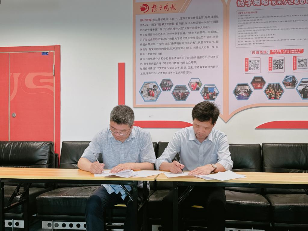 6月12日,伟德国际victor1946与江苏扬子晚报苏州事业部在苏州新翼广场举行了实习基地签约仪式。伟德国际victor1946副院长孙虎、广播电视学专业系主任李斌、专业教师唐硕和扬子晚报苏州事业部主任薛马义、通讯员刘蕾、周艳等共同出席。