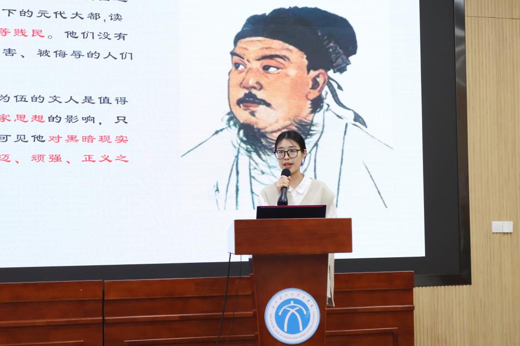 鲍老师从文献入手,分析关汉卿的生平经历及文学成就,尤其强调关汉卿作品中深刻的现实意义和积极的人生态度。在解读《窦娥冤》作品时,鲍老师从历史、社会、法制的角度,剖析窦娥之“冤”的深刻内涵。在课堂上,就“[南吕•一枝花]体现关汉卿怎样的性格”和“窦娥究竟‘冤’在何处“两个问题,鲍老师引导大家积极思考,并由小组代表上台发言。通过热烈的讨论,同学们对作家思想和作品主题有了更加全面而深入的认识。